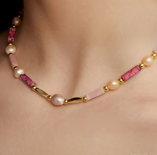 Natural Coral Red Stone with Baroque Pearl Necklace