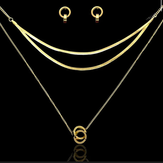 Gold Plated Stainless Steel Triple Layer "V" Necklace and Earring Set