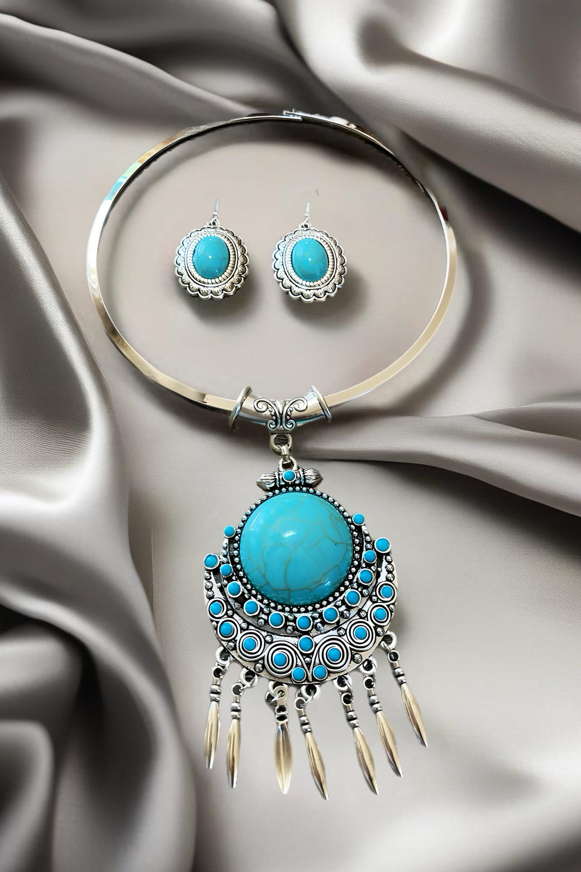 Introducing the Lab Turquoise Choker Necklace and Earring Set, a chic and contemporary accessory duo that exudes effortless elegance. The choker necklace features a series of lab-created turquoise stones, each one meticulously crafted to showcase the vibrant, earthy blue-green hues that are characteristic of this timeless gemstone. The stones are set close to the neck, creating a striking choker effect that is both modern and versatile, perfect for adding a touch of sophistication to any outfit.